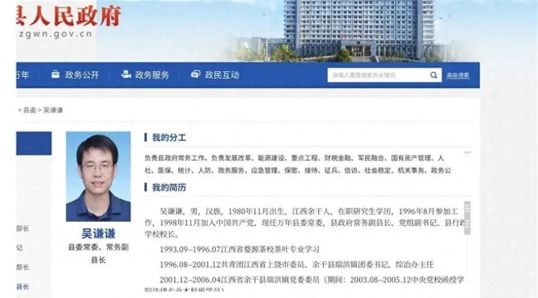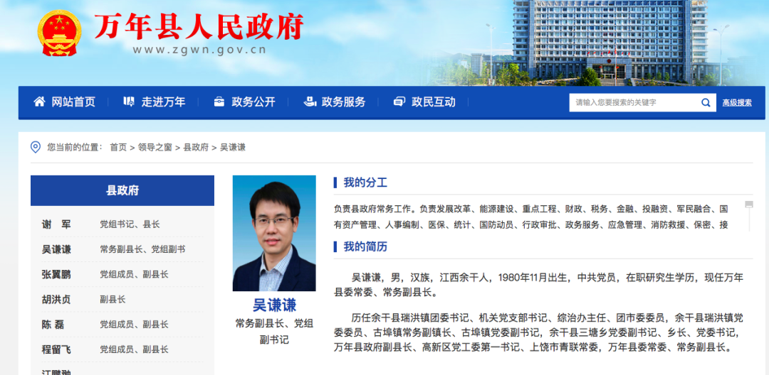 万年县政府官网上,县政府领导中只有吴谦谦的简历删减了