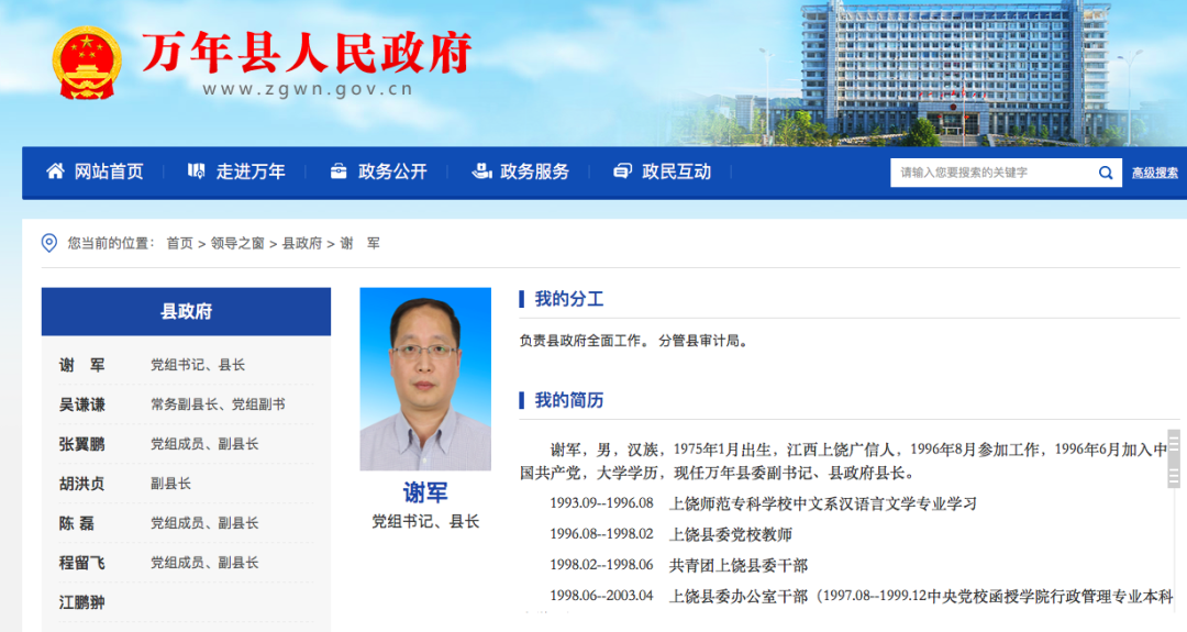 写此文时,我又去万年县人民政府官网的“领导之窗”里的“县政府领导”栏看了看,发现这两年虽然万年县政府人事略有一些变动,但万年县人民政府所有的县领导,从县长谢军到三级调研员颜红霖,所有官员的简历都是全的,从哪一年出生、哪一年参加工作、哪一年具体任什么职务,全部都是清清楚楚的,唯独还是只有吴谦谦一个人把自己过去详细的简历删改得只有出生时间了。